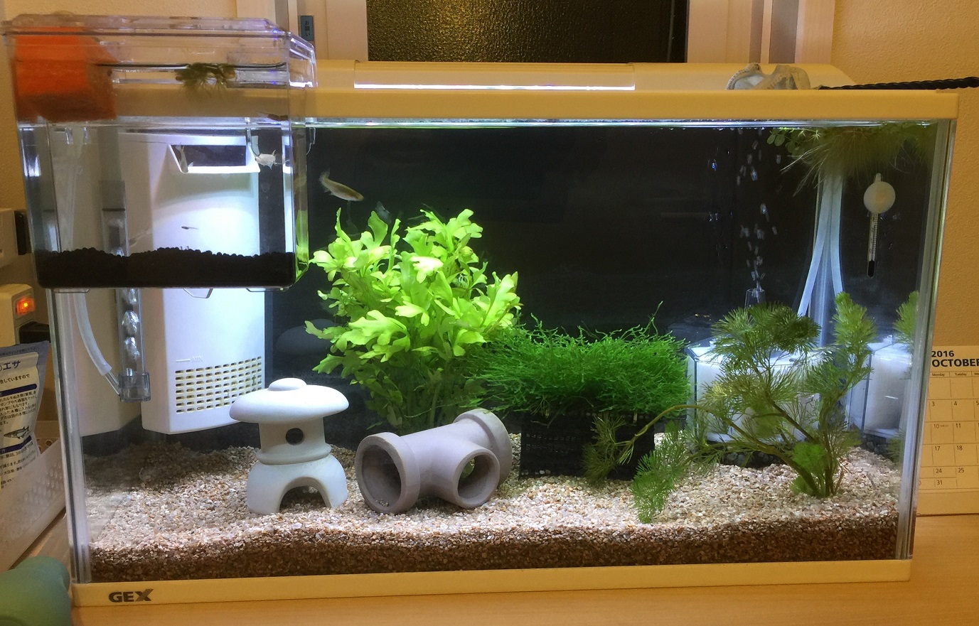 アクアリウム アクアリウム 2016年10月18日 はく 2件のコメント 夏くらいから始めました。 水槽にはメダカが入っており、サテライトにはメダカの稚魚もいます。 水草、小物の配置は素人なもんで適当です。 ミナミヌマエビも飼っていたのですが、水できていなかったのか、全滅しております。。。。 これから寒くなるので、しばらくこれ関連のネタはないかもしれないですが、細々と続けようと思います。 ※ヒーターつけたら冬でも魚追加するかも。