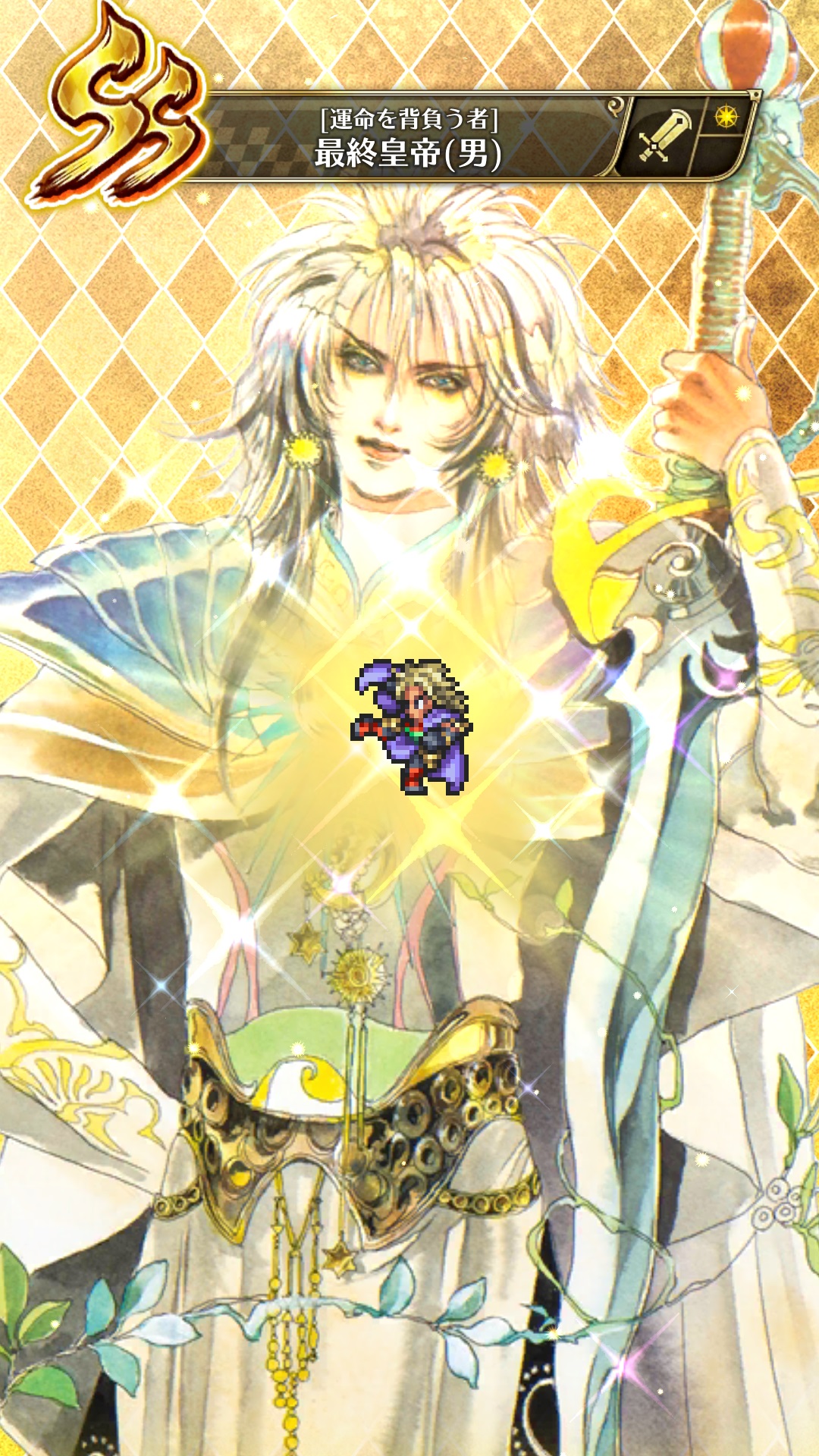 ロマサガユニバース ロマサガリユニバース 最終皇帝(男) 2019年2月24日 はく 5件のコメント ロマサガリユニバースをスマホがぶっ壊れたことをきっかけに始めてました。めずらしく、ゲームにはまっています。 ロマサガの中で思入れの強いキャラに最終皇帝があります。ようやく実装されたので、なけなしの石 (無課金がポリシー) を投入したところ、10連目ででました(奇跡)。 プレイヤーの評価はあまり良くないみたいですが、じっくり育てていこうと思っています。